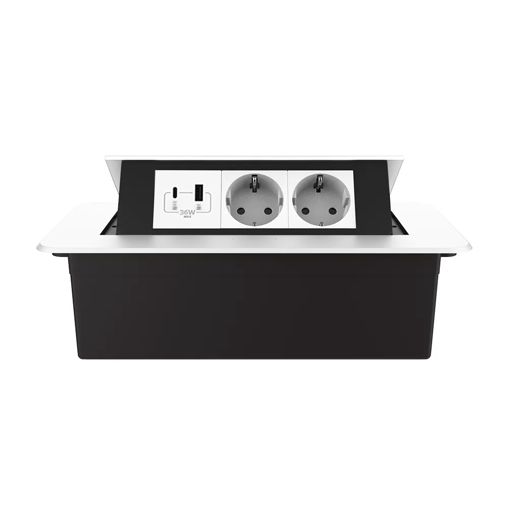 Вбудована потрійна розетка LIVOLO VL-SHS013-TC-UA.UC-WP-W з USB-A і USB Type-C 36 Вт — сучасне рішення для організації робочого простору. Модель розроблена для установки у стільницю з плавним відкриттям і надійним заземленням, що забезпечує безпеку підключених пристроїв.
