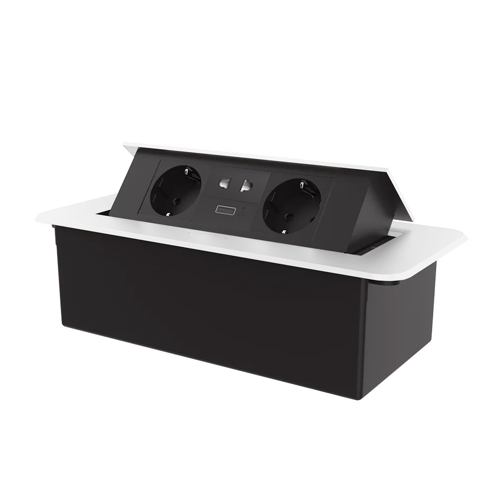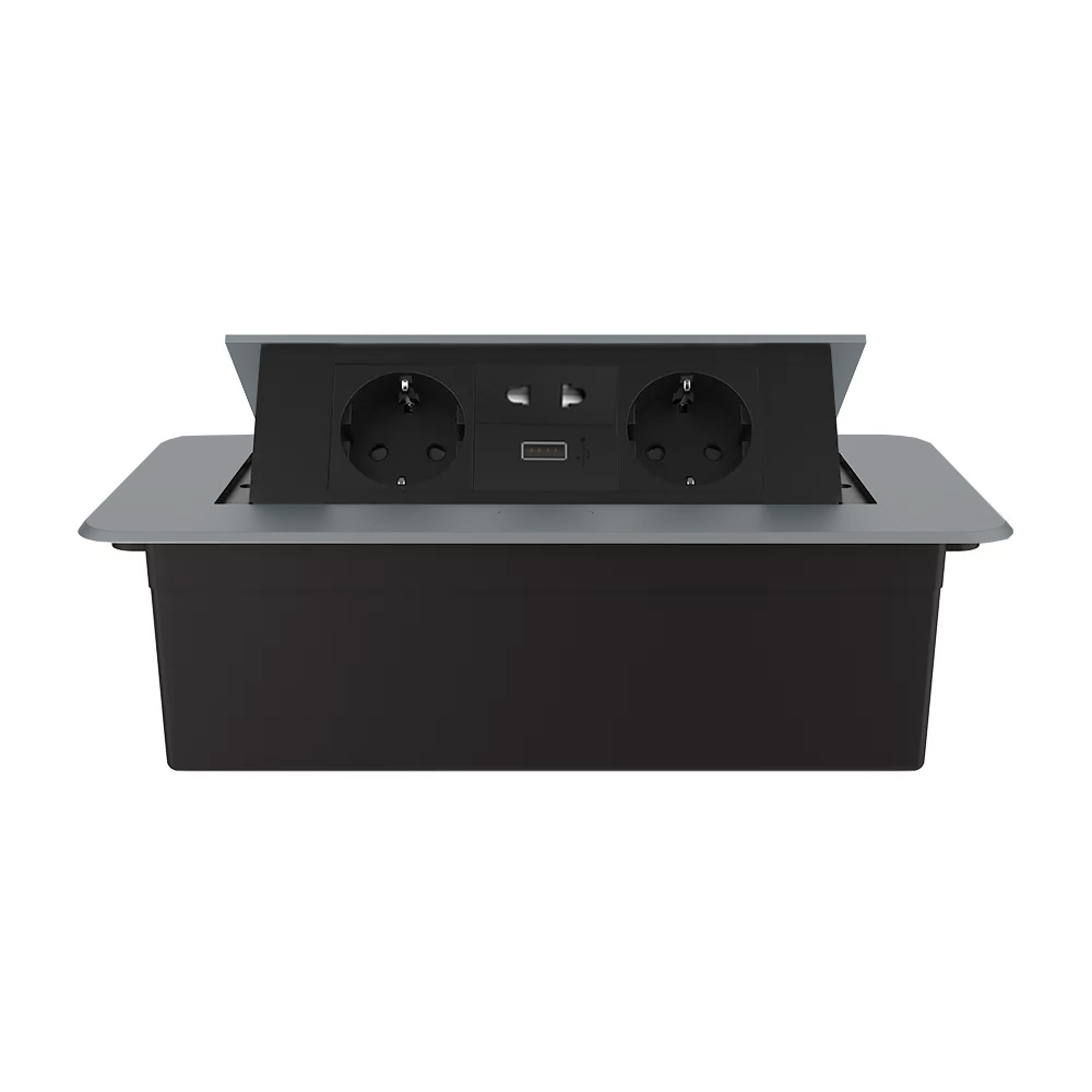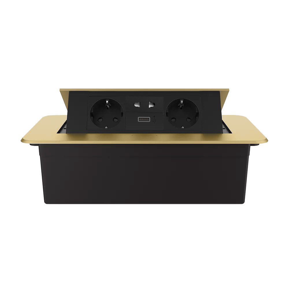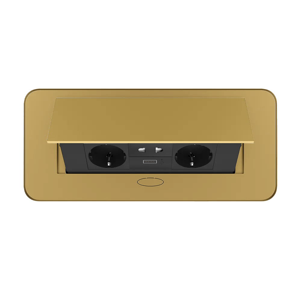 Універсальна потрійна меблева розетка LIVOLO для вбудовування у стільницю з USB, універсальною розеткою 2-в-1, плавним відкриттям і золотим дизайном.
