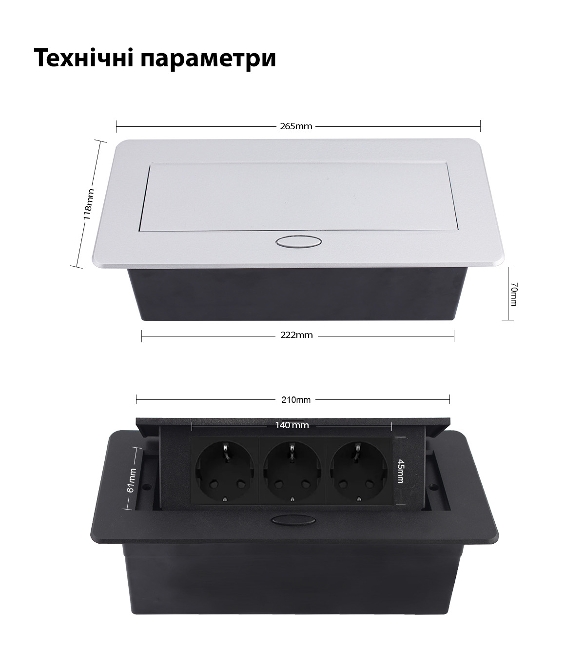 Зручна для організації робочих місць з ноутбуками, моніторами та зарядженням гаджетів. Маскується під стільницею, не псуючи дизайн приміщення.