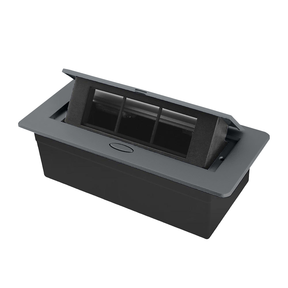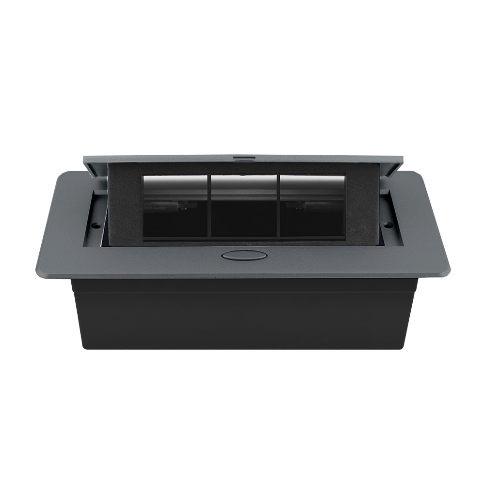 Вбудована меблева розетка LIVOLO VL-SHS013-G призначена для організації прихованої електричної мережі в кухонних стільницях, офісах чи конференц-залах. Пустий корпус глибиною 70 мм та габаритами 265×118 мм виготовлений з алюмінію сірої збірки, що забезпечує надійність та естетичний вигляд. Модель оснащена відкидним механізмом відкривання й захищена класом IP40, що виключає ризик проникнення пилу. Конструкція має 3 посадочні місця для модулів (розеток, вимикачів чи USB-портів), що дозволяє гнучко налаштувати електропостачання під ваші потреби. Виробник — Wenzhou Livolo Electric Co., Ltd., надає 60-місячну гарантію. Підходить для монтажу у меблях із внутрішньою фіксацією.